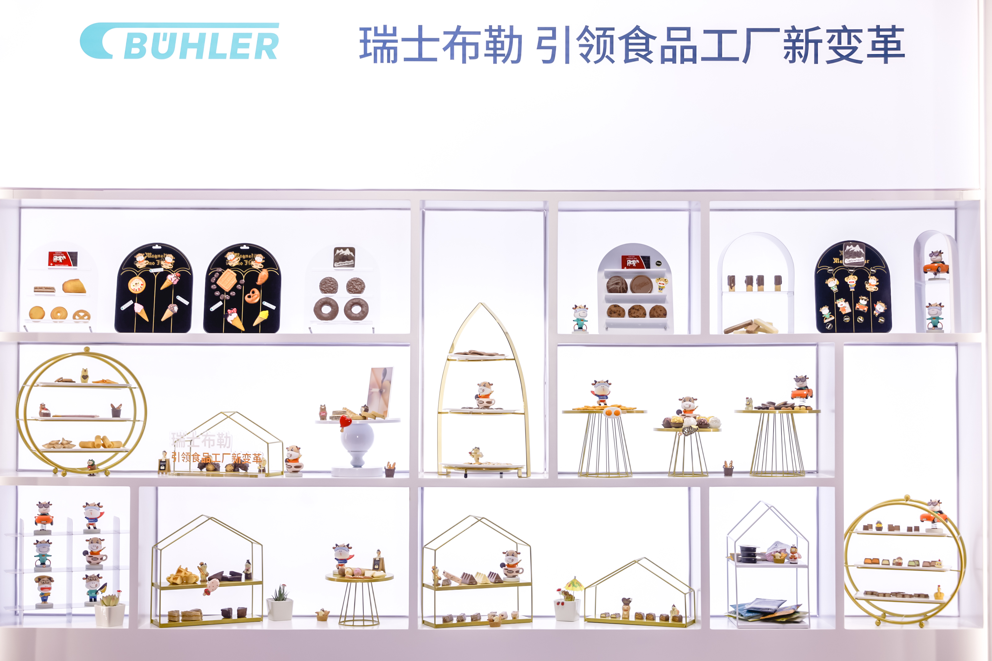 在展台的C位,展示了涵盖食品加工和工艺方案的终端产品食品墙,提供了一站式展示布勒多样化的X-BU解决方案。